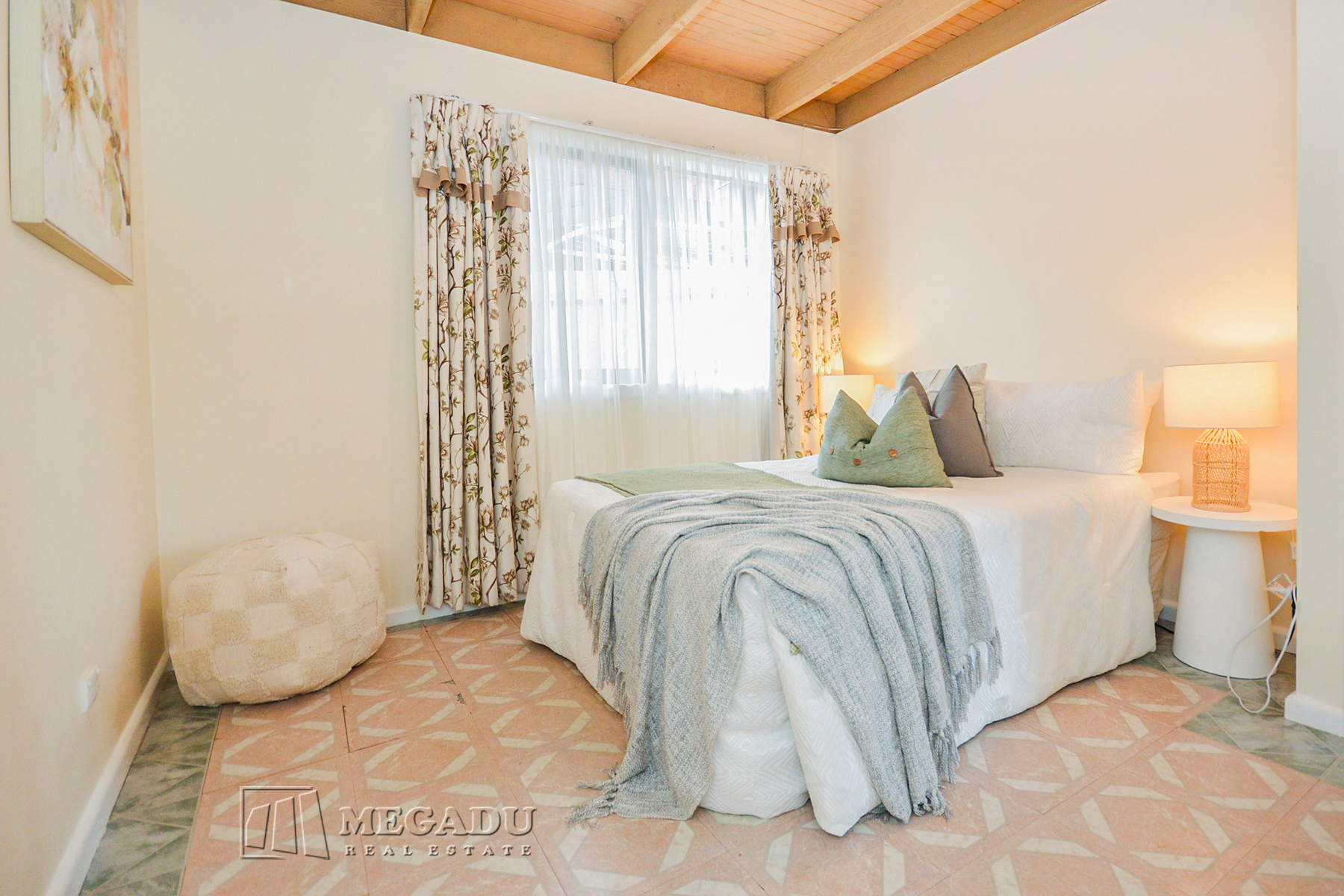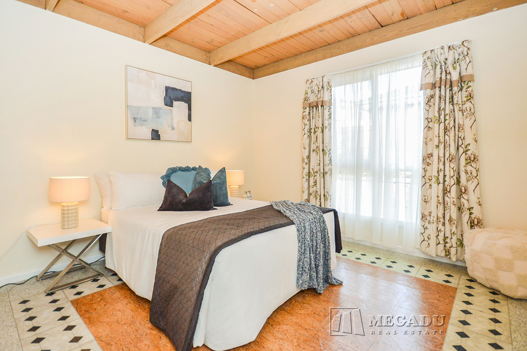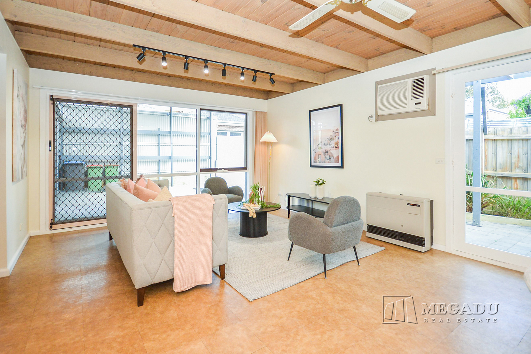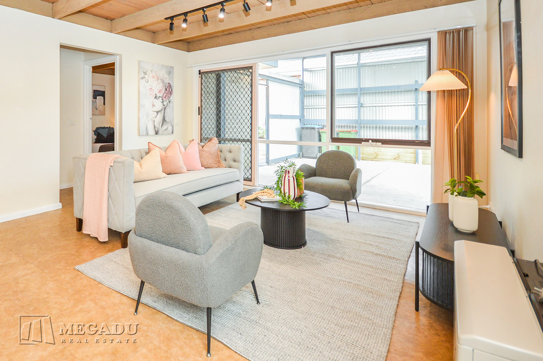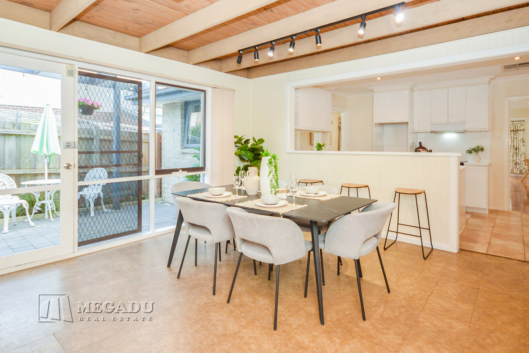 A welcoming formal lounge introduces the home, filled with natural light and a warm sense of space. The layout then flows into a large open-plan family, meals and dining zone, featuring exposed timber beams and seamless access to a private paved courtyard—ideal for entertaining, relaxing or low-maintenance gardening.